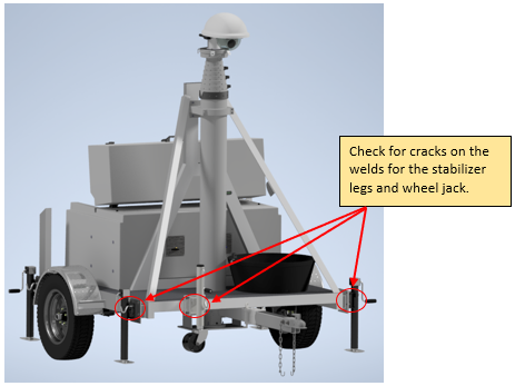 - Check for cracks in the chassis – Especially check for cracks in welds connecting the stabilizer legs and wheel jack to the aluminum chassis, as those locations obviously are critical for safety (see image below).